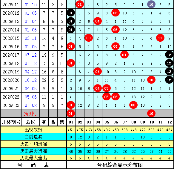后区判断:上期后区奖号为01和08,开出温码+冷码组合。最近十期后区开出10个热码、6个温码和4个冷码,本期瞻望奖号热诚热码+热码组合,参考两码01、10。