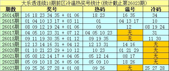大乐透第26014期-第26023期前区奖号冷温热漫衍统计: